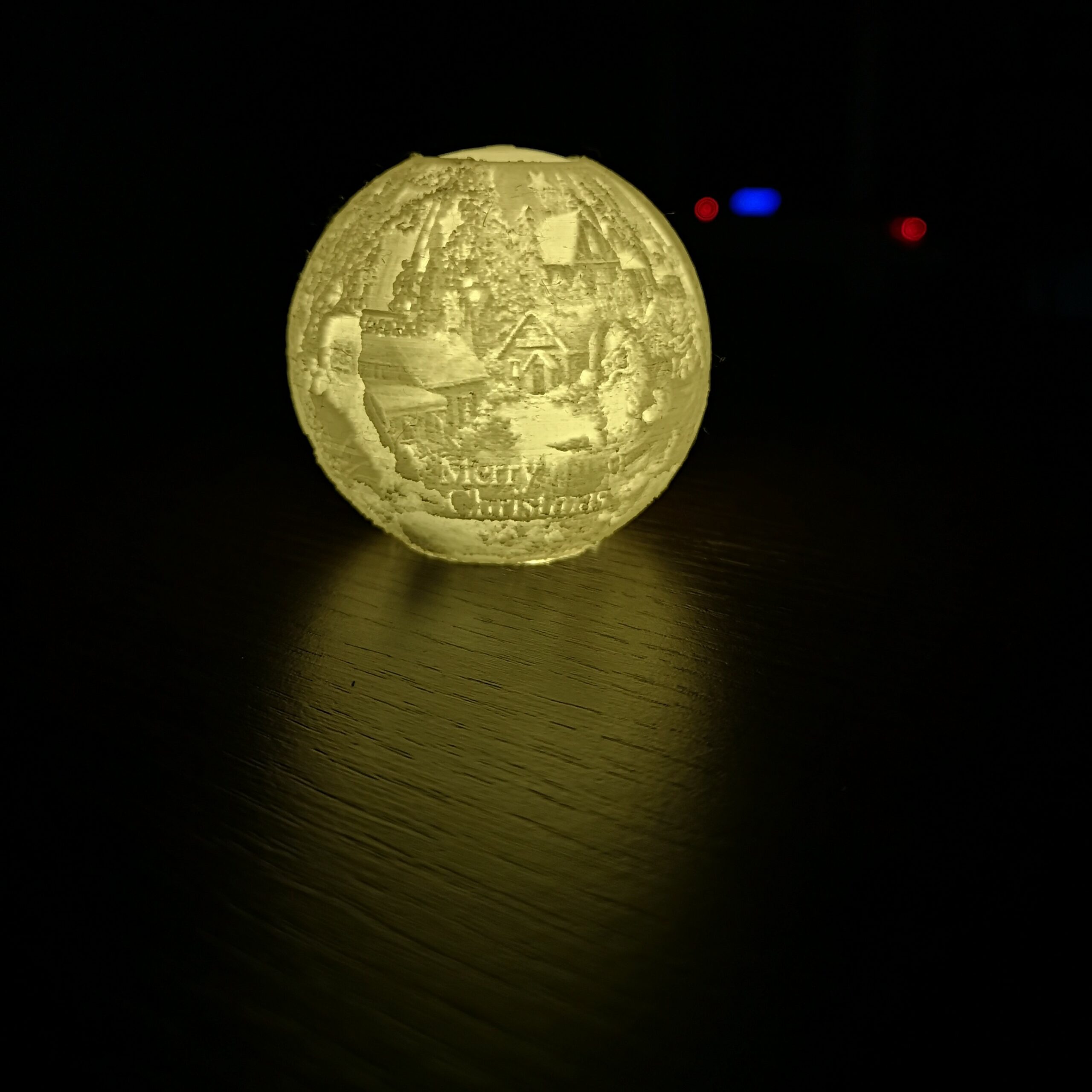 Boule de noël imprimée en 3D illuminée et personnalisée avec vos photos.